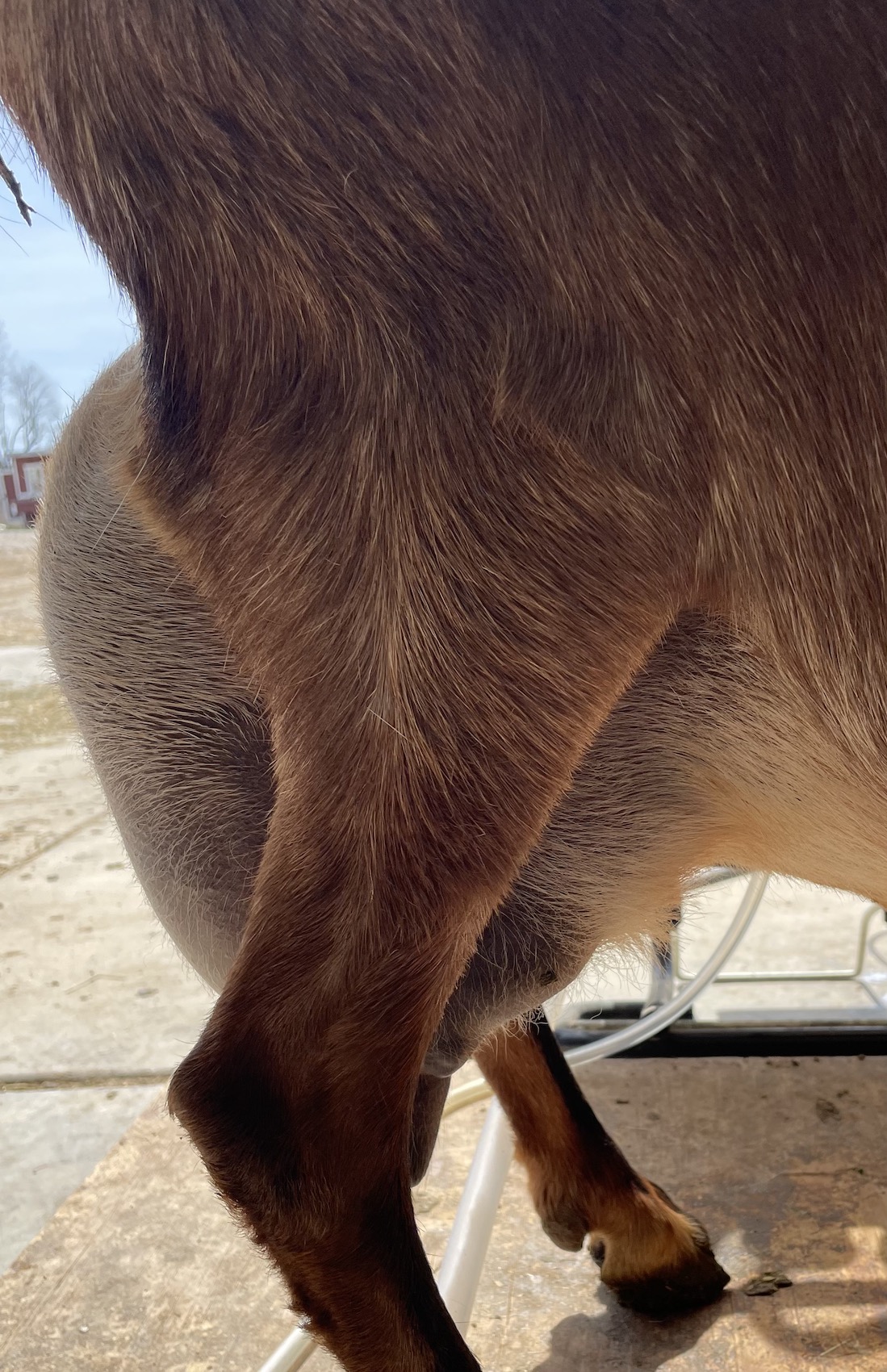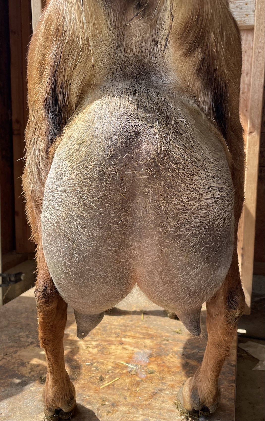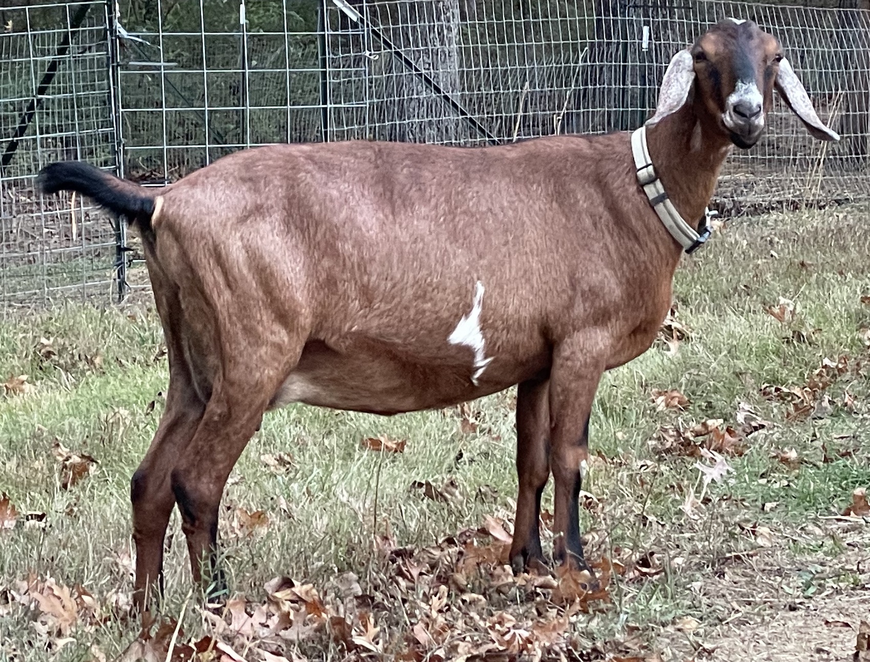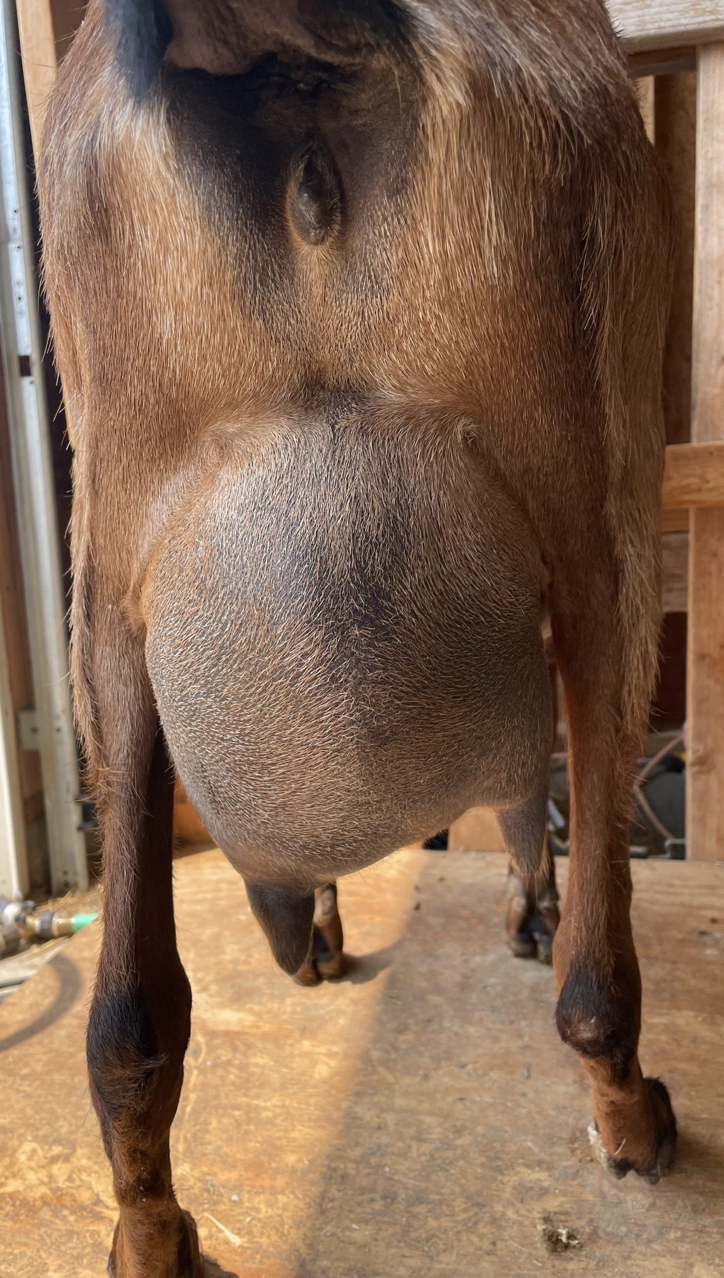 Aster is a goat with a lot of promise! While she is shy, she has her circle of deeply trusted humans. She is eager to please with  desire to understand what we want and deep sensitivity like a loyal, loving dog. I love her deep, rich red brown and coat and expressive eyes. She is very dairy with her levelness and smooth body. I expect great things from her in a year or two when she is more mature. She has recovered nicely from her 2023 mastitis. She did battle mastitis in 2023 after kidding a single buckling left one teat more vulnerable to infection. SAt peak production, her good side milked just under a full gallon a day in 2023. Aster had a lovely butterfat average that lactation over 6%. This year she has peaked at a 9.9 lbs a day in 2024 so far.