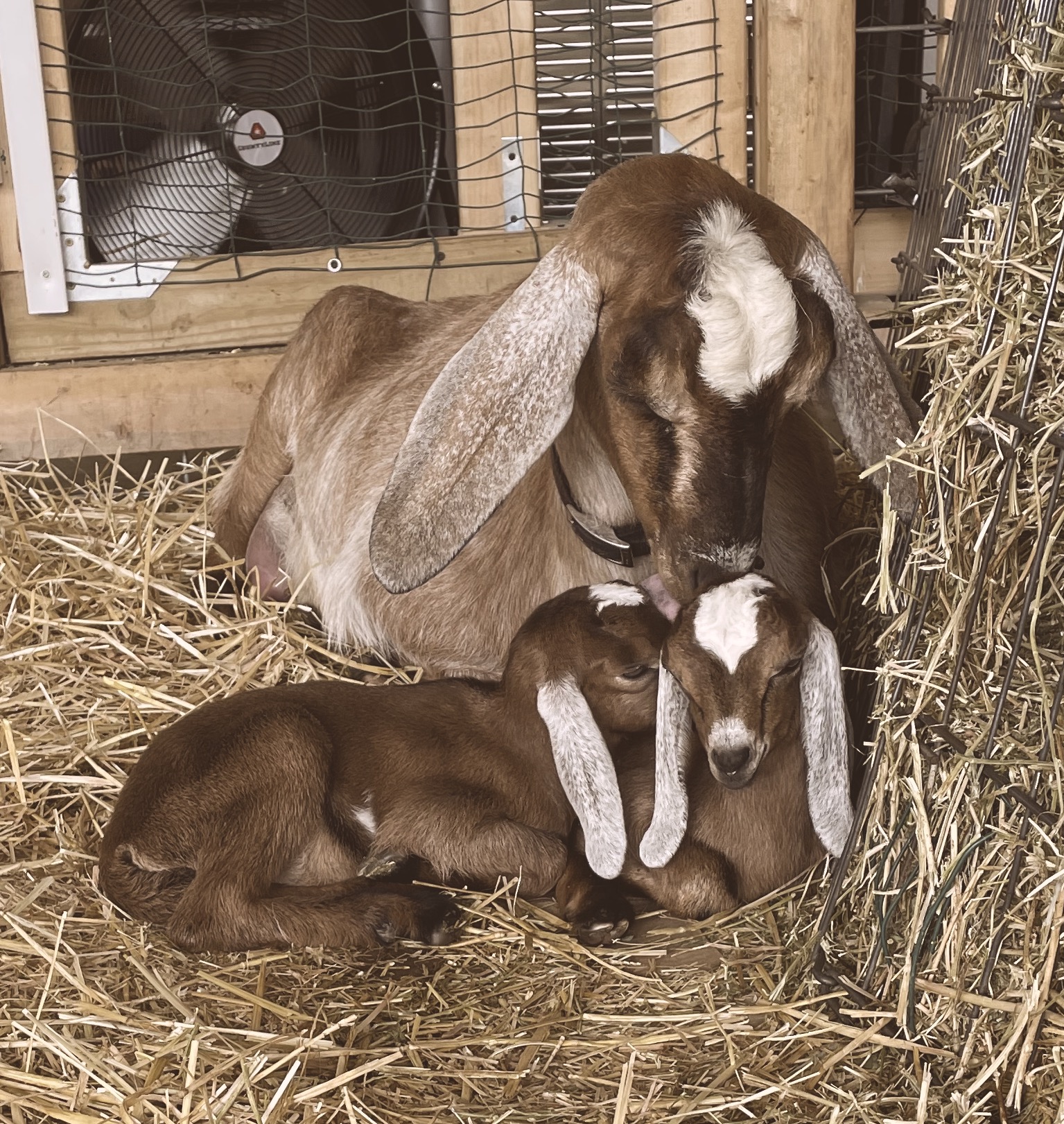 In 2022, we decided to carefully select our new boys. I fell in love with the blue roan color pattern and found State Line’s Vesper. I immediately wanted a buck version of her as our herd sire. So far, he is everything we wanted! In fact, the more I learn about his relatives, the more smitten I am. Indigo is quite related to the Nubian buck WINGWOOD FARM ARA D’ARTAGNAN who sold at the ADGA Spotlight sale in 2023 for $10,000. He has many Elite relatives and fantastic genetic potential for my herd. I also searched for a buck to add moonspots to our herd and found Terrell Creek has genetics from Windsong Farm. I had been wanting a Windsong Nubian, so things really worked out beautifully! We also added a doe from each farm and have been surprised how beautifully Peaches and Nebula have grown and warmed our hearts with their doe eyes.