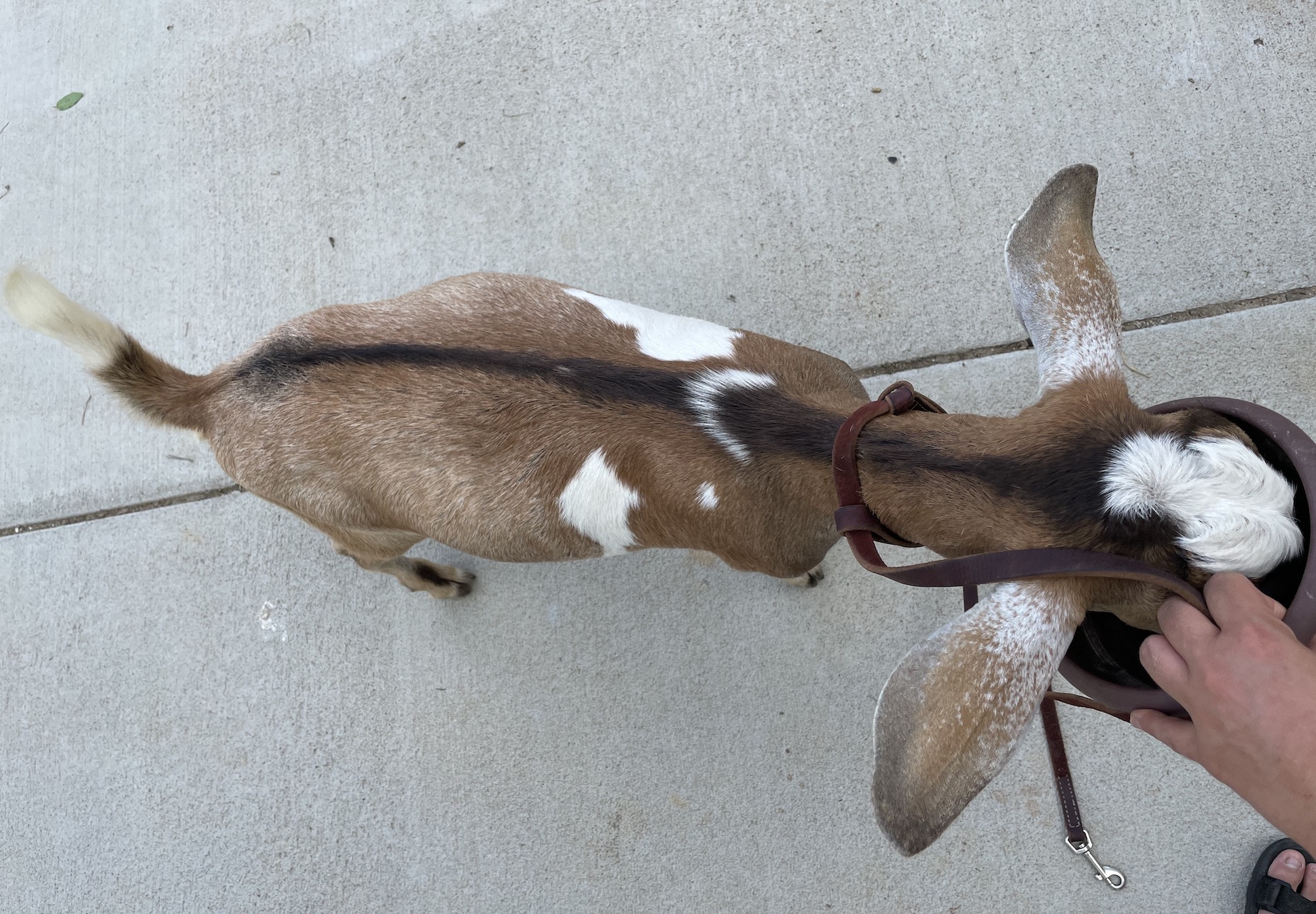 Leppy is also one of my first two goats. He is a chocolate buckskin, but his buckskin faded over time, which I have read is typical of chocolate color patterns. His chocolate coloring is actually modified black that appears brown. I learned about that when he sired a black doeling, Kicks. He sometimes plows snow with his face in the winter. Lep is a silly buck and has a lot to say all the time. I am still hoping to find udder pics for his dam but might find a half sister or too.