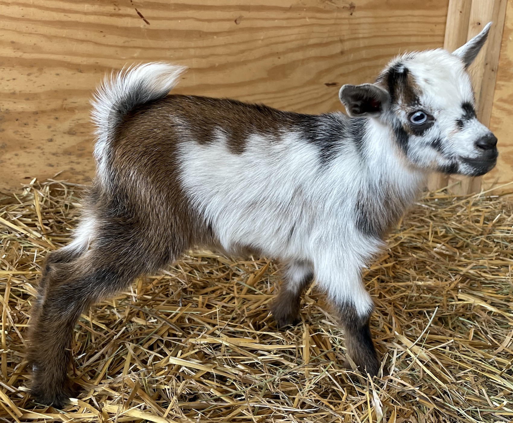Rilla was born 2/25/2024. She is a dark chocolate goat. She is daughter of Patchwork Acres ZS Delilah and Cade’s Lil Farm AX Gruff. You can see Gruff in my ND buck section! This should be a nice little milking girl, but she is a bit timid of people still. She has a sweet look in her eyes, and I have been able to pet her occasionally.
