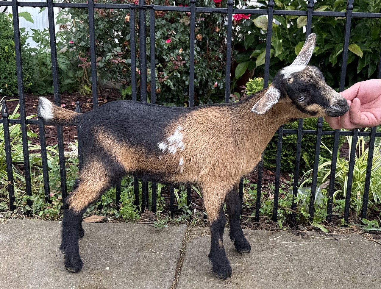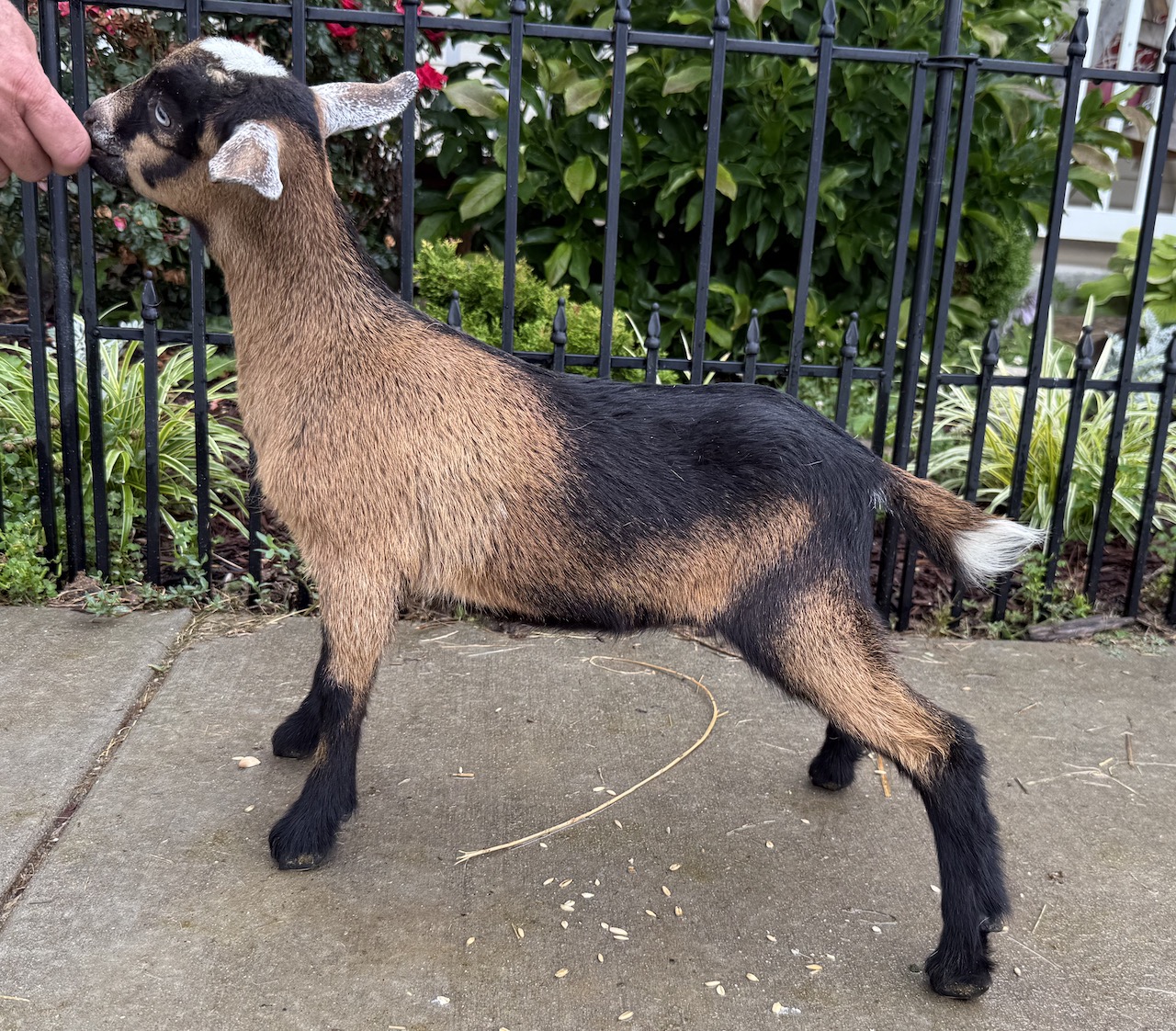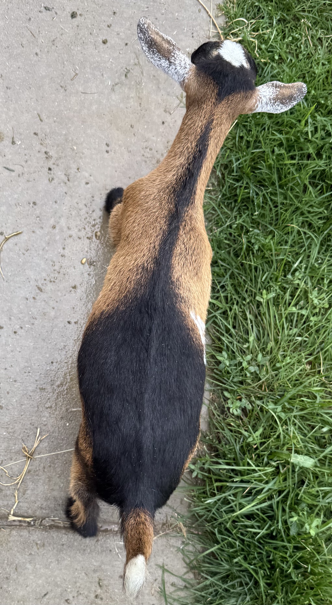 Sasha/Sashay is an F1 from the pairing of RCornerRanch PO Marley (f2 from two 50/50 parents) x *B RCornerRanch GF Hooligan (Nigerian buck). She is a cou clair with blue eyes. I expect some milk and wonderful udder structure from this 75% Nigerian cross doe kid. I was quite happy with her dam, Marley’s, ff udder in 2025.