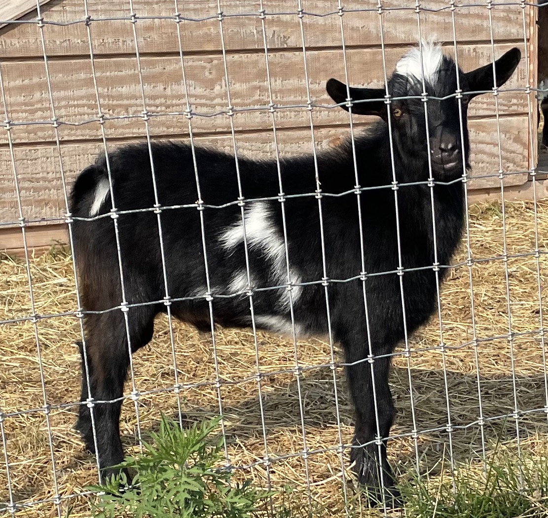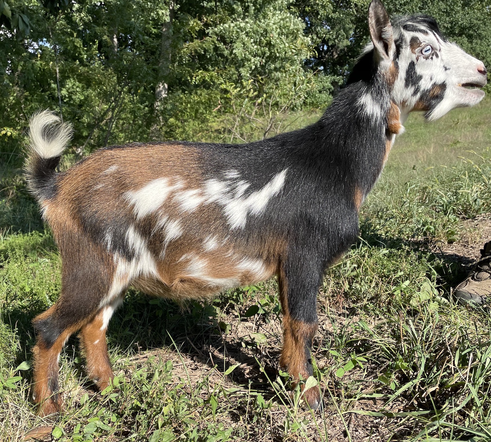 He has a great milking pedigee! Sire’s dam is an ELITE doe. Sire’s dam, SG HobbyCroft E KitKat 1M, ranked #5 in Production (1460 lbs milk) and Protein (62 lbs) in 2017 in the ADGA’s Top 10. She ranked #2 in Production (1457 lbs milk) and #9 in Butterfat (86 lbs) in 2018 in the AGS’ Top 10. She has placed on the ADGA elite list years in a row (ranked top 96% in 2023, 97% all 2020 and 2019, ranked top 98% in December and 97% August in 2018, ranked 96% all 2017). She’s won many Juju awards! Tag’s full littermate sister (Crow’s aunt) is SGCH WitchWind FB Laffy Taffy 2M/2D, who is an impressive champion animal. Laffy Taffy appraised 86 ++EV as a two year old doe. She won Bronze Juju award in 2018, Gold & Platinum Juju awards in 2019, and Gold Juju Award in 2020. In 2019, She milked 1,210 lbs milk, 68 lbs butterfat, 48 lbs protein at 2 years old. In 2020, she milked 1110 lbs milk, 69 lbs butterfat, and 46 lbs protein at 3 years old. She was an elite doe with the ADGA in 2019 and 2020. She has also, like her and her brother’s dam, placed on the elite list (ranked top 97% all year in 2020 and 2019).