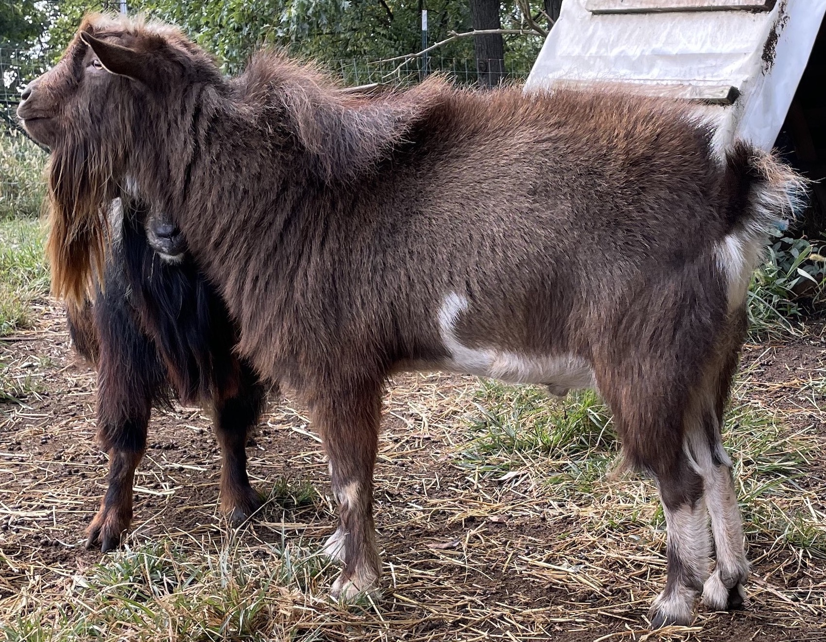 Leppy is also one of my first two goats. He is a chocolate buckskin, but his buckskin faded over time, which I have read is typical of chocolate color patterns. His chocolate coloring is actually modified black that appears brown. I learned about that when he sired a black doeling, Kicks. He sometimes plows snow with his face in the winter. Lep is a silly buck and has a lot to say all the time. I am still hoping to find udder pics for his dam but might find a half sister or too.