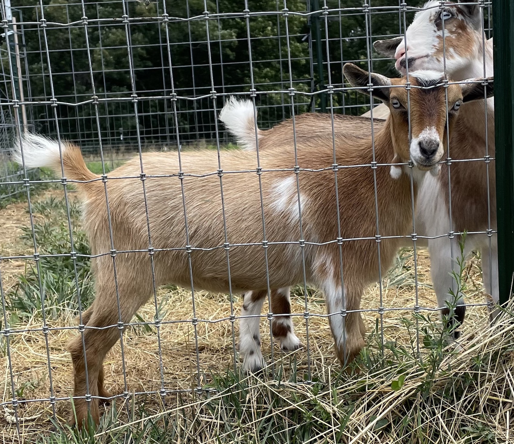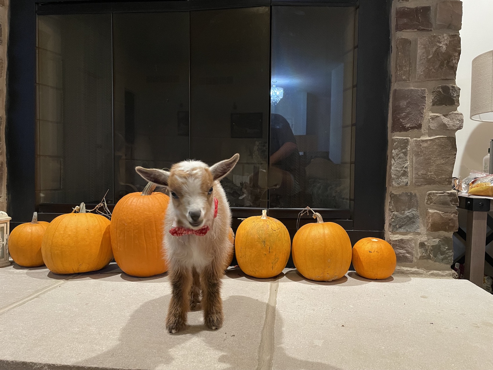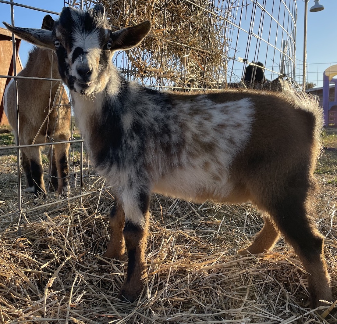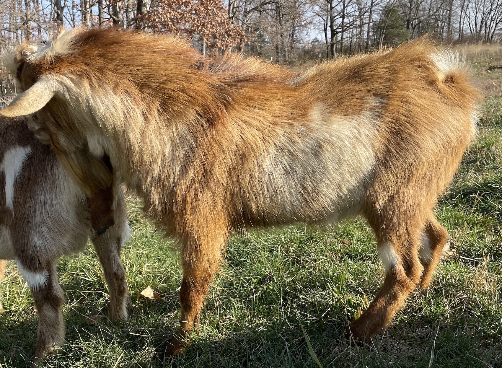 Pumpkin is special boy from our beloved Treasure. I love his great attitude and gentle nature. He is gold with white and has some gold and white roaning as well. He should be carrying some nice udder genetics, though I don’t have a good picture of Treasure’s udder. She had nice dairy skin, and colostrum came out very easily. Shamrock is Treasure’s twin sister, so her udder pictures will give you an idea of Pumpkin’s genetics. It was so hard losing her, but I am very grateful to have a beautiful kid from her. He is a pleasure to have around and has sired some very cute kids!