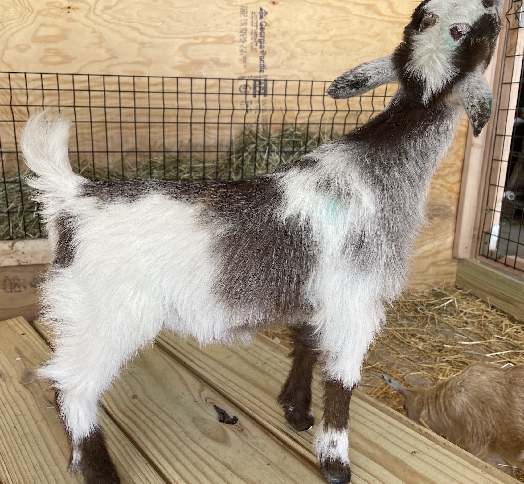 Daughter of Fable and Bambi (April May). Clem has wattles and blue eyes. I don’t know exactly where her interesting coloring came from. I can see Fable is producing kids with nice brisket extension, shoulders, and leg angulation.